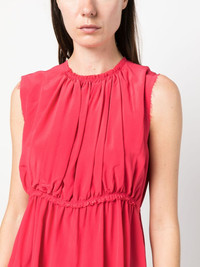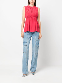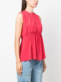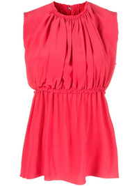 ruched sleeveless silk blouse Dimension-enhancing ruched details at the front transform the simple silhouette of Lanvin’s watermelon pink top. Subtle ruffles at the fitted waistline contribute to the textural finish. Highlights - Watermelon pink - Silk - Ruched detailing - Round neck - Sleeveless - Fitted waistline - Straight hem Imported Composition Silk 100% SIZE & FIT Model measurements Height 5 ft 10 in(1.78 m) Bust/Chest 33.46 in(85 cm) Hips 36.22 in(92 cm) Waist 23.22 in(59 cm) FittingInformation Designed to be unstructured, offering a loose fit throughout Made from a lightweight non-stretch fabric This piece fits true to size – take your usual size