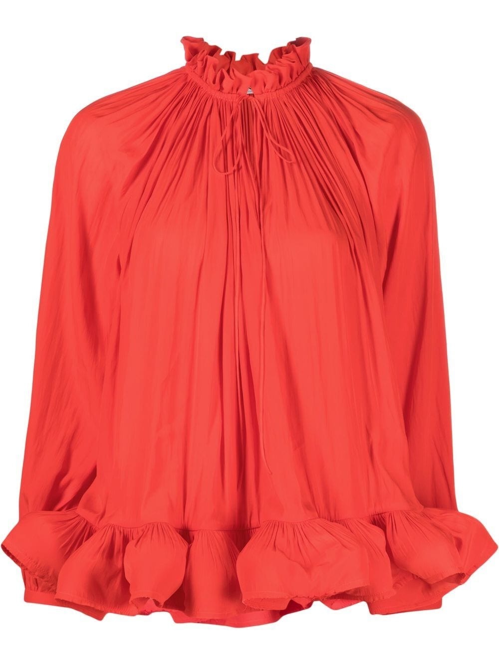 ruffled gathered blouse The ruffled detailing on this Lanvin blouse accentuate its flowy nature, in a look that is reminiscent of Victorian styles. Cut from a lightweight fabric that is designed to drape elegantly over the body, this garment is finished with a dainty bow at the neckline, enhancing its romantic feel. Imported Composition Polyester 100% SIZE & FIT Model measurements Height 5 ft 10 in(1.78 m) Bust/Chest 31.49 in(80 cm) Hips 35.03 in(89 cm) Waist 23.62 in(60 cm) FittingInformation This piece fits true to size. We recommend you get your regular size Cut for a loose fit Made with a mid-weight non-stretch fabric Washing instructions Dry Clean Only