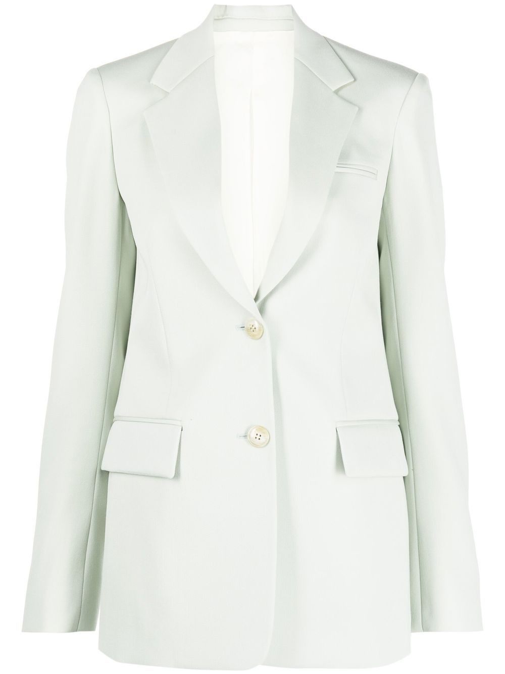 single-breasted virgin wool blazer Lanvin's blazer riffs on traditional suiting. Tailored from virgin wool, this pale green iteration has notched lapels riffing on tuxedo silhouettes with a slightly curved shape. Made in Italy Composition Outer: Virgin Wool 100%, Buffalo Horn 100% Lining: Cupro 100% SIZE & FIT Model measurements Height 5 ft 10 in(1.78 m) Bust/Chest 30.7 in(78 cm) Hips 33.85 in(86 cm) Waist 23.22 in(59 cm) FittingInformation This piece fits true to size. We recommend you get your regular size Cut for a slim fit Made with a mid-weight non-stretch fabric Washing instructions Dry Clean Only