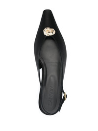 Swing slingback pumps Lanvin is renowned for its sleek and luxurious aesthetic, as seen with the Swing mules. The pair is embellished with a glimmering jewel at the toe. Highlights - Black - Calf leather - Decorative plaque - Pointed toe - Buckle-fastening slingback strap - Flat sole Made in Italy Composition Sole: Calf Leather 100% Lining: Goat Skin 100% Outer: Fabric 100% SIZE & FIT Measurement HEEL 0.98 in(2.5 cm)