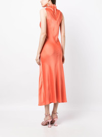 draped satin maxi dress Highlights - Orange - Satin finish - High neck - Sleeveless - Calf-length - A-line Made in United States Composition Body: Acetate 61%, Viscose 39% SIZE & FIT Model measurements Height 5 ft 10 in(1.78 m) Bust/Chest 30.31 in(77 cm) Hips 34.64 in(88 cm) Waist 24.01 in(61 cm) FittingInformation Designed for a slim fit that sits just away from the body offering a close yet comfortable fit Made from a midweight non-stretch fabric This piece fits true to size – take your usual size