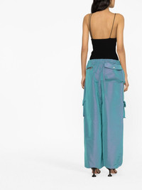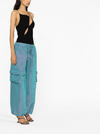 low-rise cargo pants High-shine fabrics and expressive designs continue to be a hit in LaQuan Smith's SS23 collection. With a distinguished iridescent effect, these cargo pants find inspiration in utilitarian designs by boasting multiple pockets, a relaxed fit and adjustable ankles. Highlights - Aqua green - High-shine finish - Iridescent effect - Low-rise - Elasticated drawstring waistband - Two side pouch pockets - Multiple cargo pockets - Rear zip-fastening pocket - Drawstring cuffs Made in United States Composition Polyester 100% SIZE & FIT Model measurements Height 5 ft 10 in(1.78 m) Bust/Chest 31.49 in(80 cm) Hips 35.03 in(89 cm) Waist 23.62 in(60 cm)