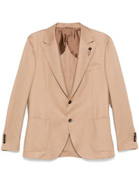 brooch-detail blazer Highlights - Camel brown - Interlock weave - Front button fastening - Peak lapels - Brooch detail - Long sleeves - Buttoned cuffs - Chest welt pocket - Dart detailing - Two front patch pockets - English rear vents - Partial lining - Straight hem Made in Italy Composition Viscose 52%, Cupro 48%, Wool 35%, Cashmere 35%, Silk 30% SIZE & FIT FittingInformation Designed for a slim fit, offering a comfortable fit that sits just away from the body The vented hem offers movement at the rear Made from a midweight non-stretch fabric Washing instructions Dry Clean Only