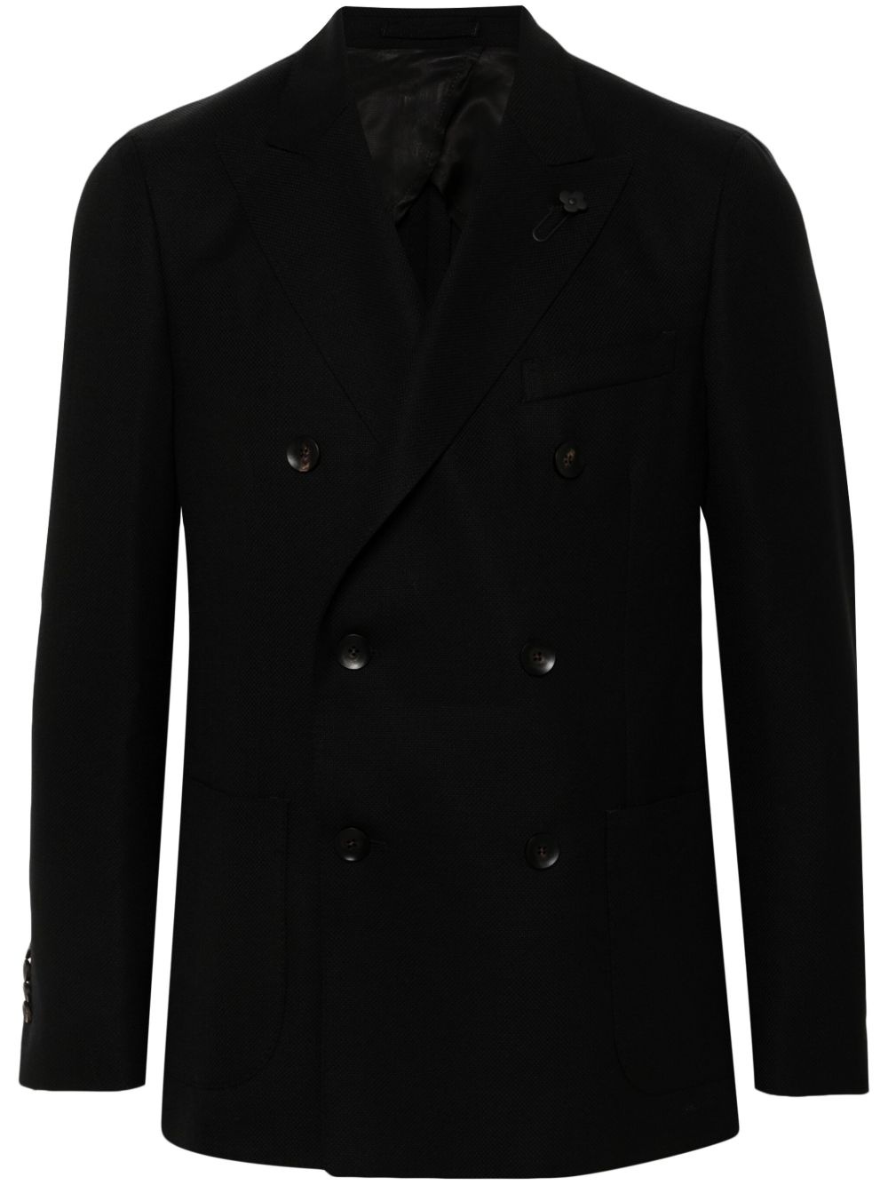 brooch-detail blazer Highlights - Black - Wool - Interlock weave - Peak lapels - Brooch detail - Long sleeves - Buttoned-cuff sleeves - Chest welt pocket - Two side patch pockets - English rear vents - Multiple internal slip pockets - Partial lining - Double-breasted button fastening Made in Italy Composition Lining: Viscose 52%, Cupro 48% Outer: Wool 100% SIZE & FIT Model measurements Height 6 ft 2 in(1.87 m) Bust/Chest 36.41 in(92.5 cm) Hips 37 in(94 cm) Waist 29.52 in(75 cm) FittingInformation Designed for a slim fit, offering a comfortable fit that sits just away from the body The vented hem offers movement at the rear Made from a midweight non-stretch fabric This piece fits true to size – take your usual size