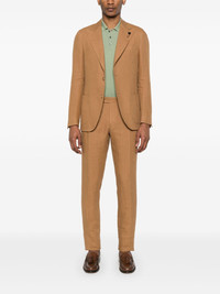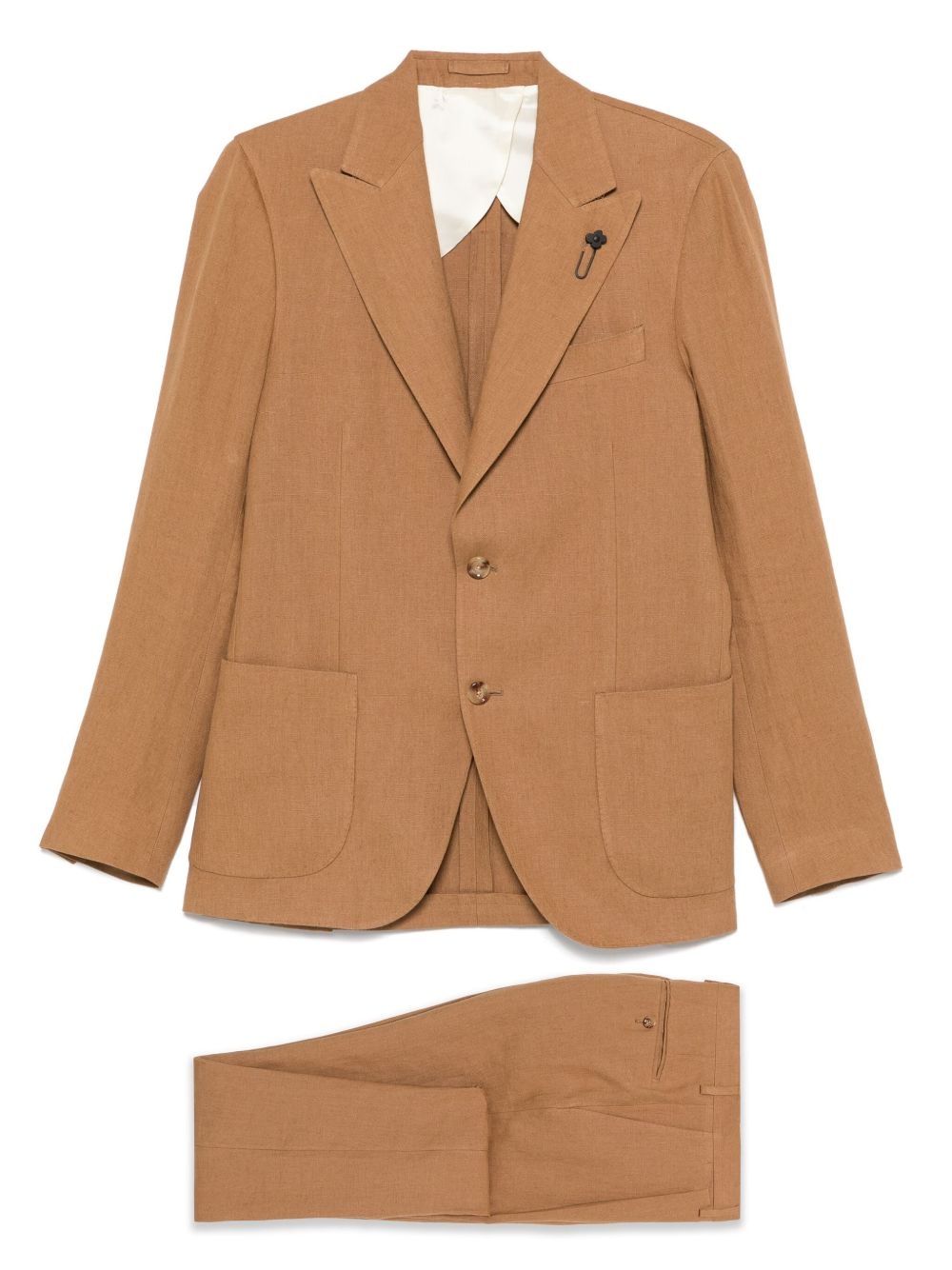 brooch-detail suit Highlights - Ochre brown - Front button fastening - Concealed fly and button fastening - English rear vents - Two side slash pockets Made in Italy Composition Linen/Flax 100%, Viscose 52%, Cupro 48% SIZE & FIT Model measurements Height 6 ft 2 in(1.87 m) Bust/Chest 36.22 in(92 cm) Hips 37 in(94 cm) Waist 27.95 in(71 cm) FittingInformation Tailored for a slim fit, offering a comfortable fit that sits just away from the body The vented hem offers movement at the rear Made from a midweight non-stretch fabric, this piece offers minimal elasticity when worn
