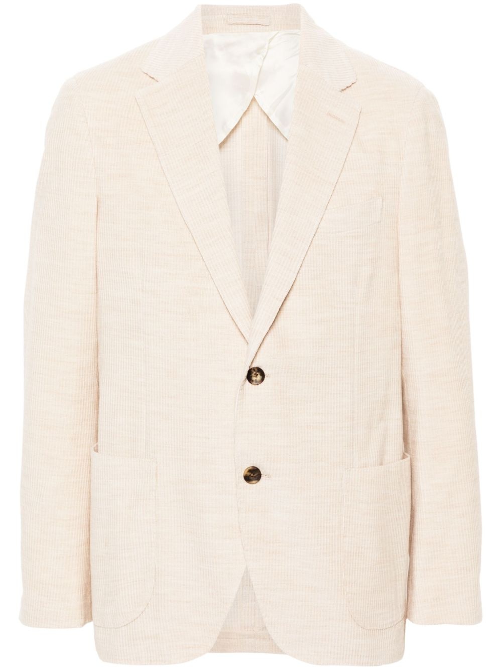 corduroy blazer Highlights - Light beige - Cotton-alpaca wool blend - Corduroy - Notched lapels - Long sleeves - Buttoned-cuff sleeves - Chest welt pocket - Two side patch pockets - English rear vents - Multiple internal slip pockets - Partial lining - Front button fastening Made in Italy Composition Outer: Cotton 87%, Alpaca Wool 13% Lining: Viscose 52%, Cupro 48% SIZE & FIT Model measurements Height 6 ft 2 in(1.87 m) Bust/Chest 37.79 in(96 cm) Hips 37.79 in(96 cm) Waist 30.31 in(77 cm) FittingInformation Designed for a slim fit, offering a comfortable fit that sits just away from the body The vented hem offers movement at the rear Made from a midweight non-stretch fabric This piece fits true to size – take your usual size