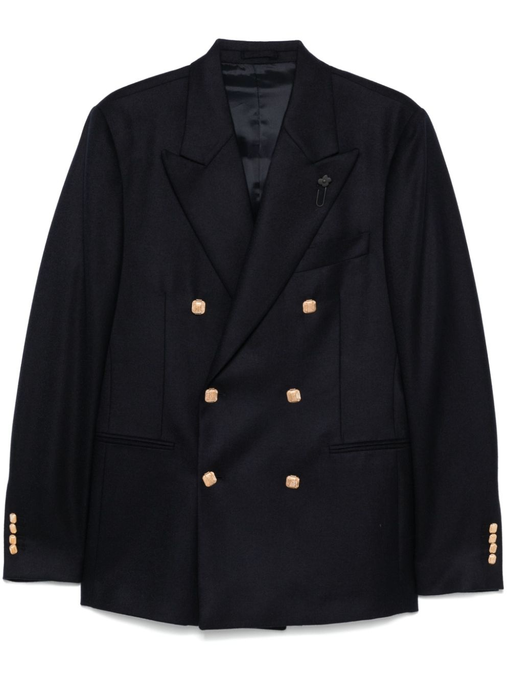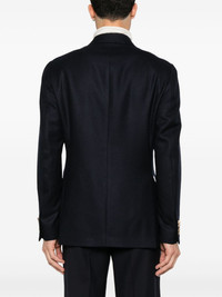 double-breasted blazer Highlights - Navy blue - Cashmere - Textured finish - Double-breasted button fastening - Peak lapels - Long sleeves - Chest welt pocket - Two side jetted pockets - English rear vents - Full lining - Straight hem Made in Italy Composition Lining: Viscose 52%, Cupro 48% Outer: Cashmere 100% SIZE & FIT Model measurements Height 6 ft 1 in(1.85 m) Bust/Chest 35.82 in(91 cm) Hips 37.79 in(96 cm) Waist 29.13 in(74 cm) FittingInformation Designed for a slim fit, offering a comfortable fit that sits just away from the body The vented hem offers movement at the rear Made from a midweight non-stretch fabric Washing instructions Dry Clean Only
