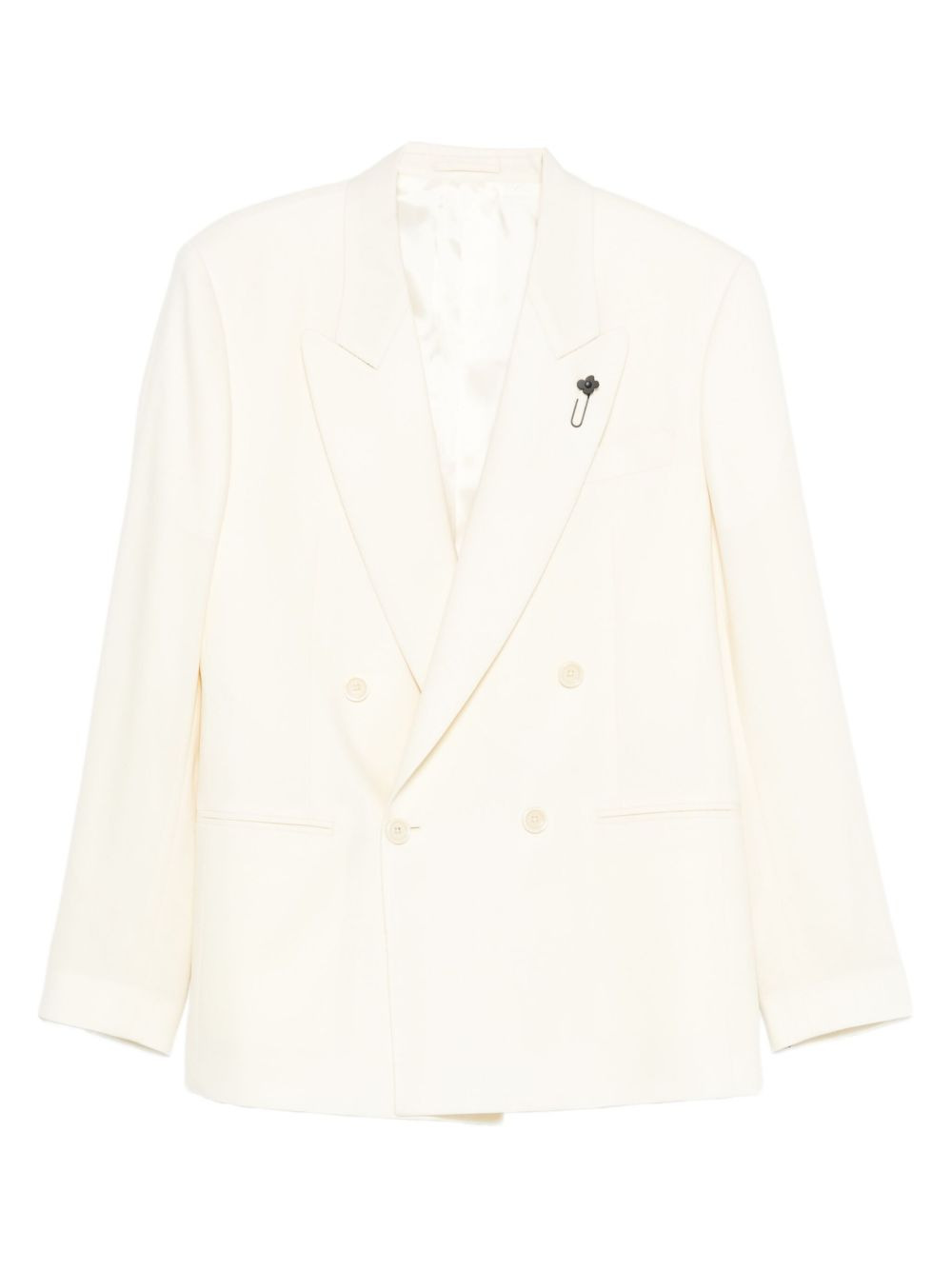 double-breasted blazer Highlights - Off-white - Double-breasted closure - Peak lapels - Button fastening - Welt pockets - Brooch detail Made in Italy Composition Lining: Viscose 52%, Cupro 48% Outer: Virgin Wool 100% SIZE & FIT Model measurements Height 6 ft 1 in(1.85 m) Bust/Chest 35.82 in(91 cm) Hips 37.79 in(96 cm) Waist 29.13 in(74 cm) Washing instructions Dry Clean Only