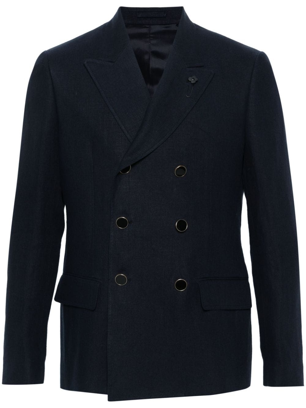 double-breasted blazer Highlights - Navy blue - Linen/flax - Slub texture - Peak lapels - Brooch detail - Shoulder pads - Long sleeves - Dart detailing - Two front flap pockets - Enamel buttons - Internal jetted pocket - Satin lining - Double-breasted button fastening Made in Italy Composition Lining: Viscose 52%, Cupro 48% Outer: Linen/Flax 100% SIZE & FIT Model measurements Height 6 ft 2 in(1.87 m) Bust/Chest 38.18 in(97 cm) Hips 36.61 in(93 cm) Waist 29.13 in(74 cm) FittingInformation Designed for a boxy fit, intended for a loose fit throughout The vented hem offers movement at the rear Made from a midweight non-stretch fabric This piece fits true to size – take your usual size