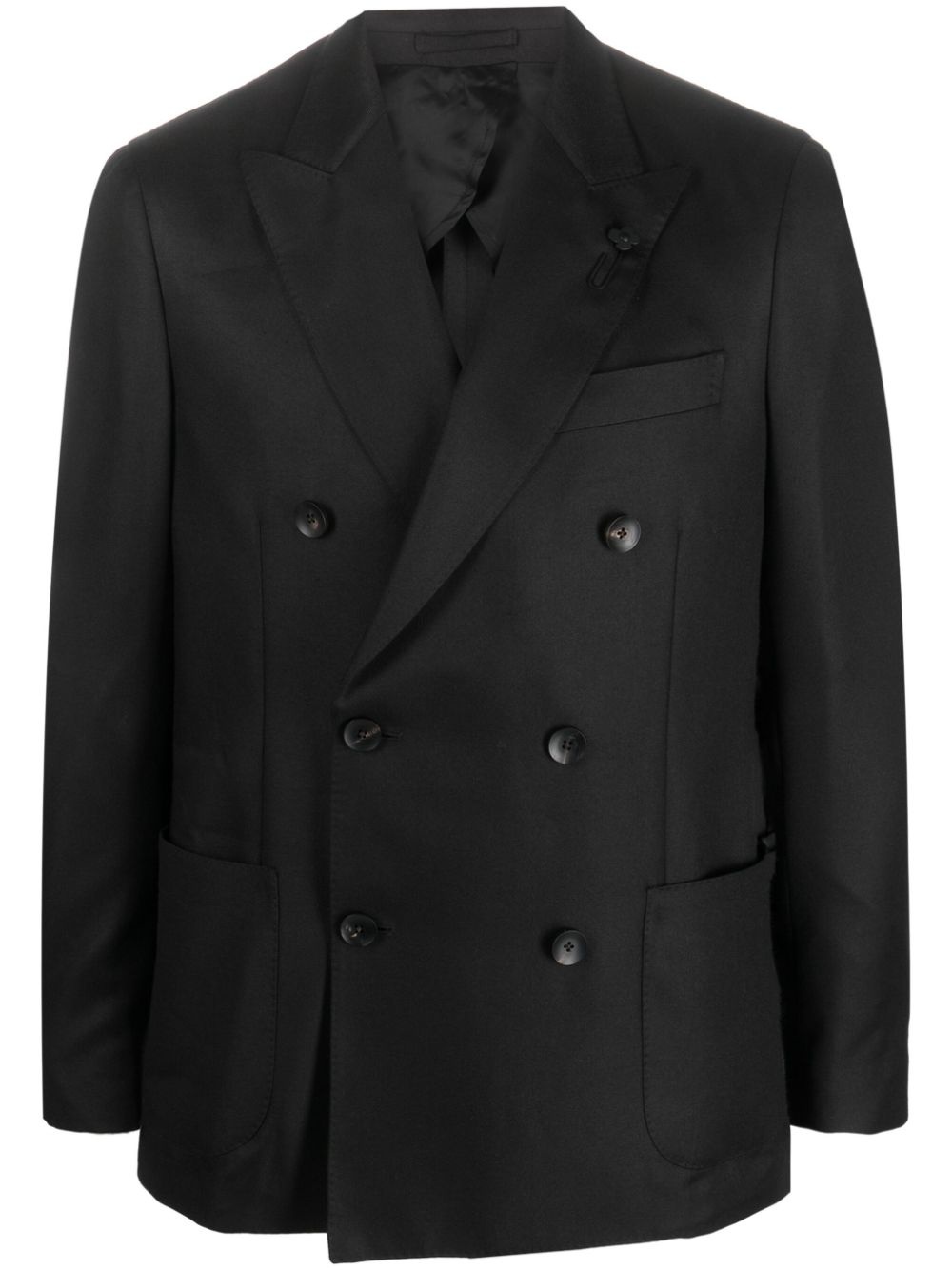 double-breasted satin-finish blazer Highlights - Black - Cashmere-silk blend - Satin finish - Brooch detail - Wide peak lapels - Double-breasted button fastening - Long sleeves - Buttoned cuffs - Chest welt pocket - Two front patch pockets - English rear vents - Straight hem Made in Italy Composition Outer: Cashmere 35%, Wool 35%, Silk 30% Lining: Polyester 100% SIZE & FIT Model measurements Height 6 ft 2 in(1.87 m) Bust/Chest 38.18 in(97 cm) Hips 36.61 in(93 cm) Waist 29.13 in(74 cm)
