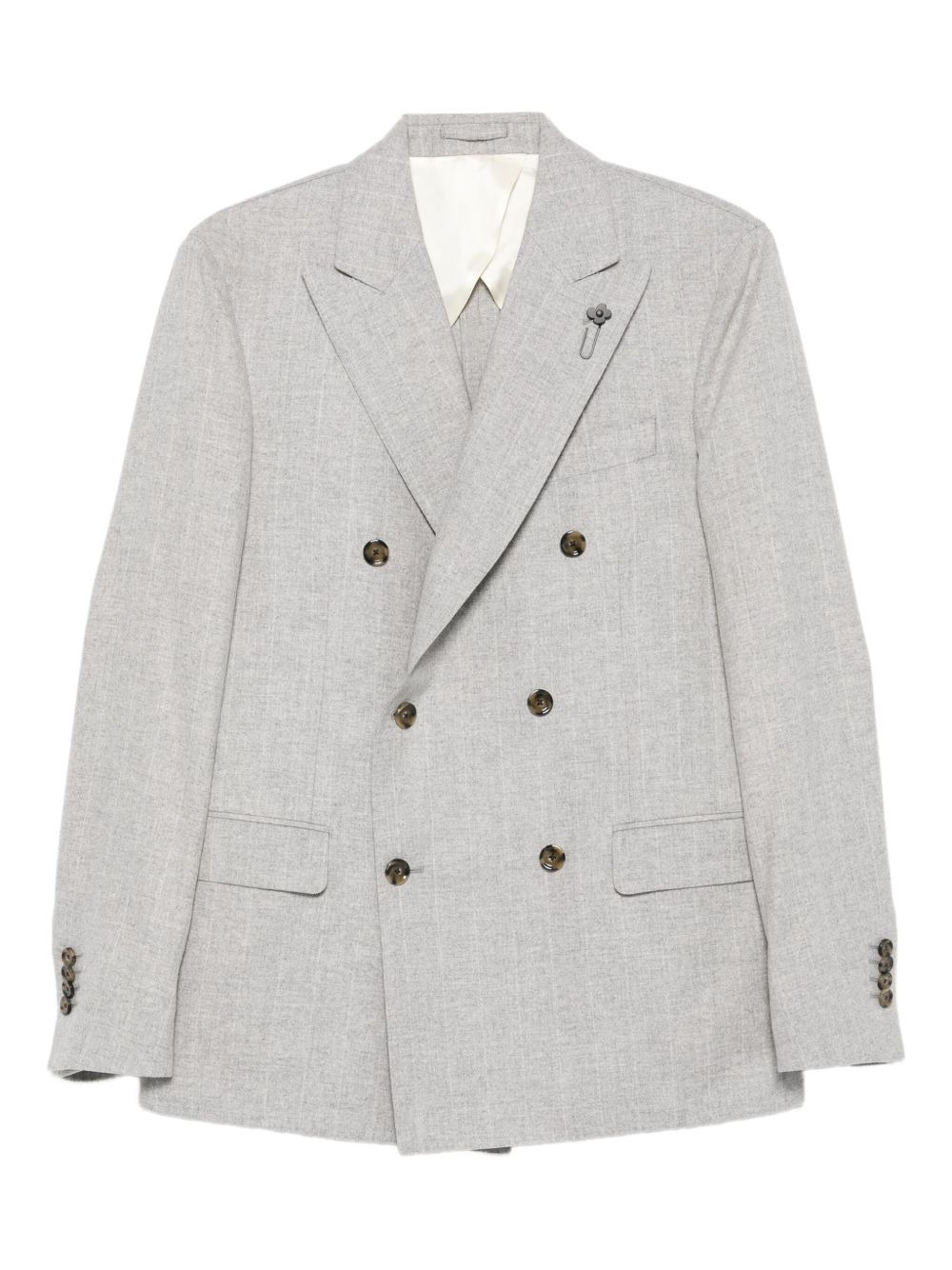 double-breasted wool suit Highlights - Light grey - Double-breasted closure - Peak lapels - Straight pockets - Wool Made in Italy Composition Wool 100%, Silk 100% SIZE & FIT Model measurements Height 6 ft 2 in(1.87 m) Bust/Chest 36.41 in(92.5 cm) Hips 37 in(94 cm) Waist 29.52 in(75 cm)