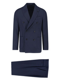 double-breasted wool suit Highlights - Blue - Double-breasted - Flower pin - Button fastening - Pockets - Virgin wool Made in Italy Composition Virgin Wool 98%, Elastane 2% Washing instructions Read Manufacturer Guidelines