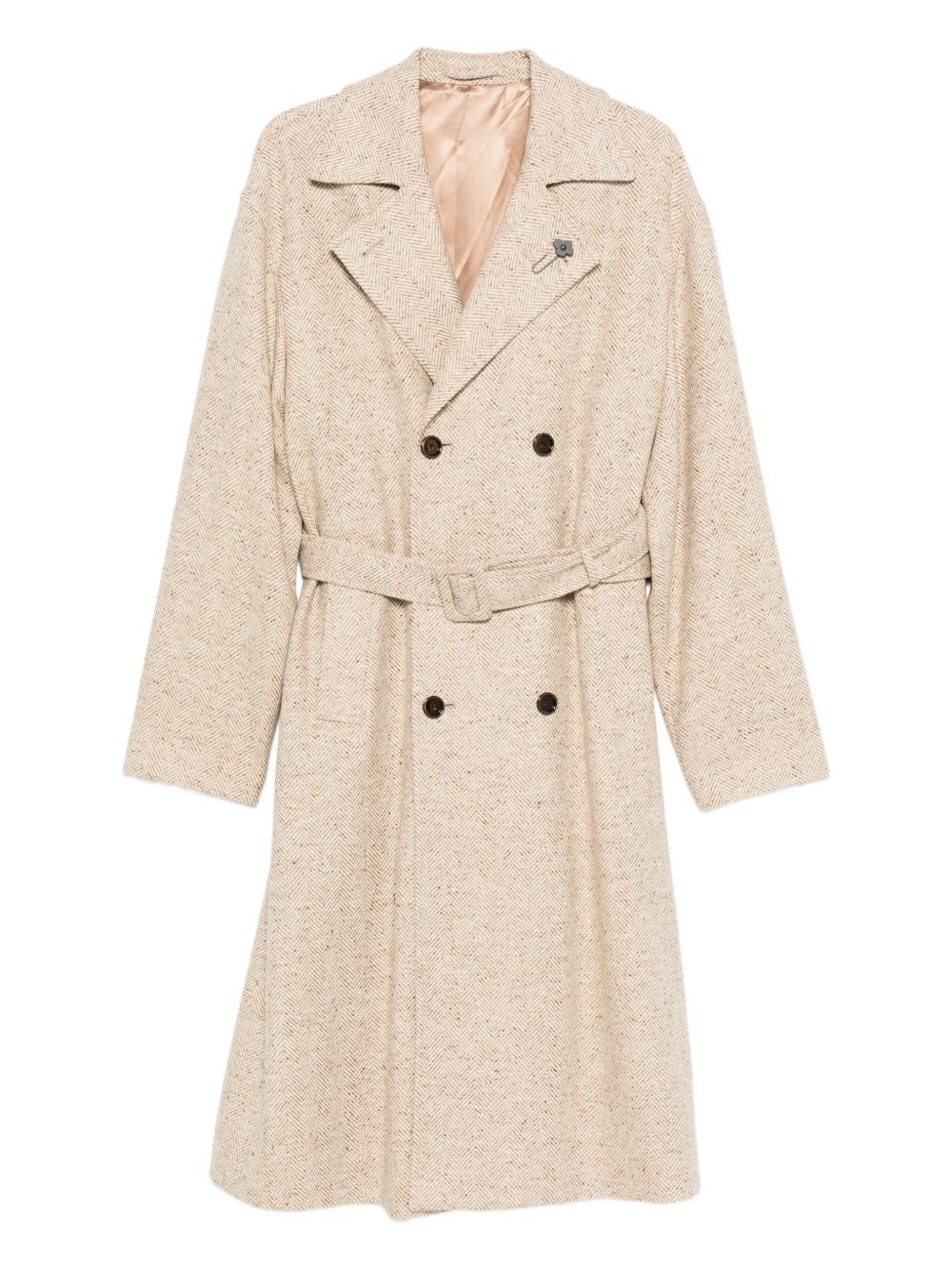 herringbone belted coat Highlights - Beige - Herringbone pattern - Double-breasted fastening - Belted waist - Long sleeves - Notched lapels Made in Italy Composition Lining: Acetate 65%, Viscose 35% Outer: Virgin Wool 100% SIZE & FIT Model measurements Height 6 ft 1 in(1.85 m) Bust/Chest 35.82 in(91 cm) Hips 37.79 in(96 cm) Waist 29.13 in(74 cm) Washing instructions Dry Clean Only