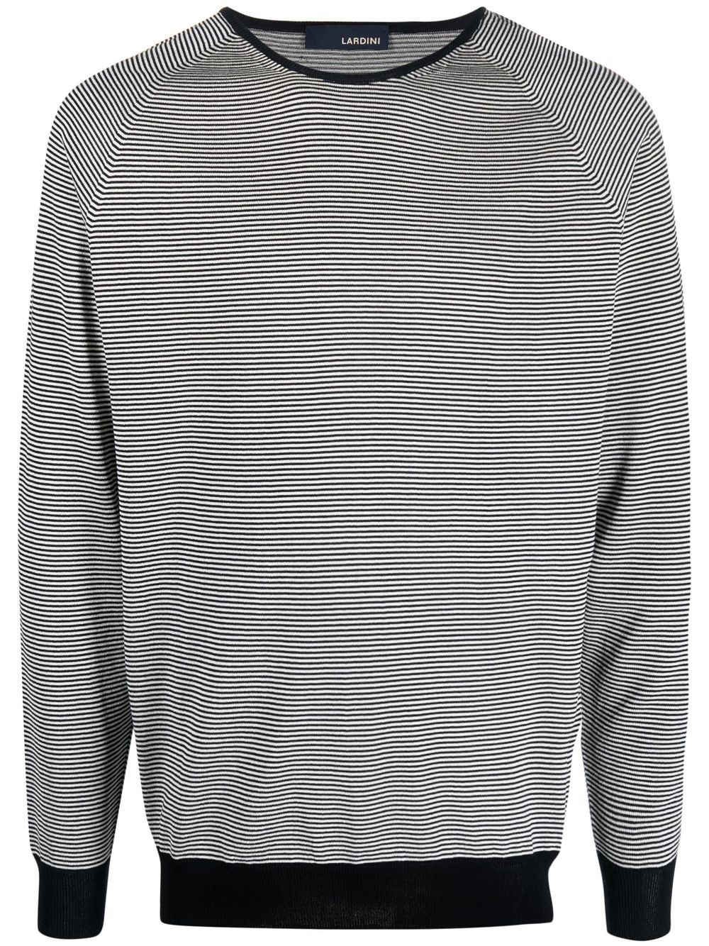 horizontal-stripe crew neck jumper dark blue/white cotton blend horizontal stripe pattern crew neck long sleeves ribbed cuffs and hem straight hem Made in Italy Composition Cotton 57%, Viscose 43% SIZE & FIT Model measurements Height 6 ft 2 in(1.87 m) Bust/Chest 35.82 in(91 cm) Hips 35.43 in(90 cm) Waist 27.95 in(71 cm) FittingInformation This piece fits true to size. We recommend you get your regular size Cut for a relaxed fit Made with a mid-weight fabric