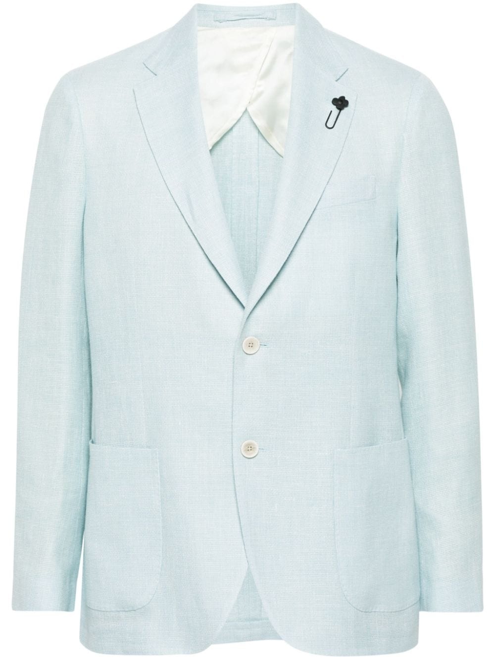 intertwined linen-blend blazer Highlights - Blue/white - Linen-wool blend - Intertwined design - Dart detailing - Brooch detail - Notched lapels - Shoulder pads - Long sleeves - Faux-buttoned cuffs - English rear vents - Chest welt pocket - Two front patch pockets - Two internal jetted pockets - Front button fastening - Curved hem - Partial lining Made in Italy Composition Outer: Linen/Flax 75%, Wool 25% Lining: Viscose 52%, Cupro 48% SIZE & FIT Model measurements Height 6 ft 1 in(1.86 m) Bust/Chest 36.61 in(93 cm) Hips 37 in(94 cm) Waist 28.74 in(73 cm) FittingInformation Designed for a slim fit, offering a comfortable fit that sits just away from the body The vented hem offers movement at the rear Made from a midweight non-stretch fabric This piece fits true to size – take your usual size