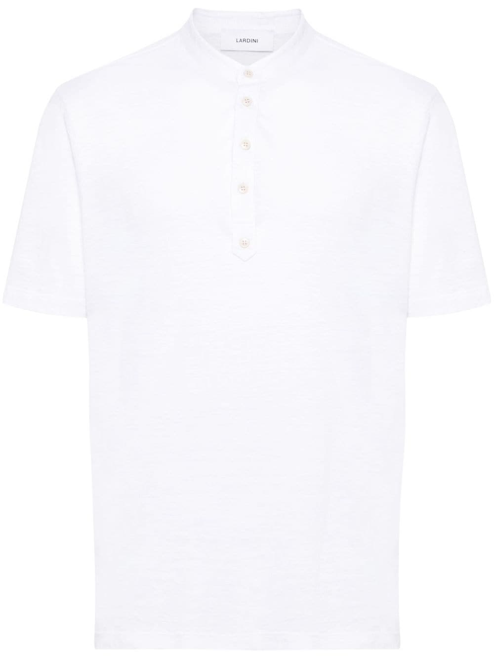 mock-neck linen T-shirt Highlights - White - Linen/flax - Slub texture - Mock neck - Short sleeves - Front button placket - Straight hem Made in Italy Composition Linen/Flax 100% SIZE & FIT Model measurements Height 6 ft 2 in(1.87 m) Bust/Chest 38.18 in(97 cm) Hips 36.61 in(93 cm) Waist 29.13 in(74 cm) FittingInformation Designed for a regular fit allowing for a comfortably loose fit throughout the body Made from a midweight non-stretch fabric, this piece offers minimal elasticity when worn This piece fits true to size – take your usual size