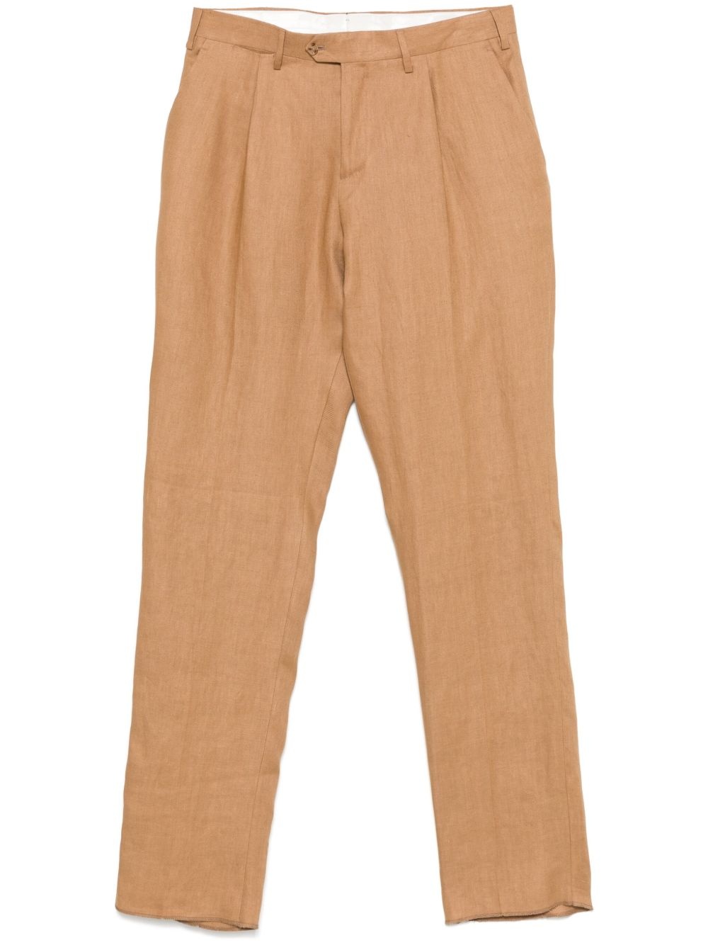 pleat-detail trousers Highlights - Almond beige - Front button and zip fastening - Belt loops - Two diagonal pockets to the sides - Two rear button-fastening jetted pockets Made in Italy Composition Linen/Flax 100%, Polyester 65%, Cotton 35% Washing instructions Dry Clean Only