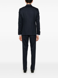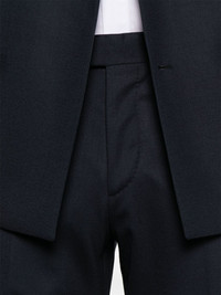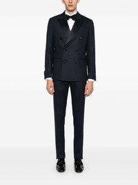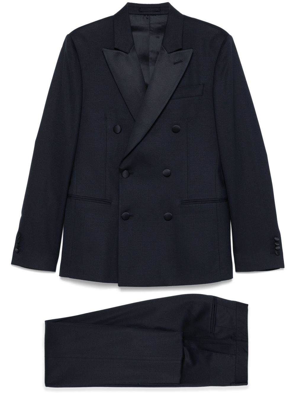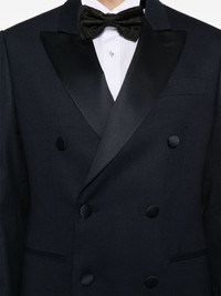 satin-lapels suit Highlights - Navy blue - Double-breasted button fastening - Concealed front button, hook and zip fastening - Internal pocket - English rear vents Made in Italy Composition Virgin Wool 98%, Viscose 52%, Cupro 48%, Elastane 2% SIZE & FIT Model measurements Height 6 ft 2 in(1.87 m) Bust/Chest 36.41 in(92.5 cm) Hips 35.43 in(90 cm) Waist 29.52 in(75 cm) FittingInformation Tailored for a slim fit, offering a comfortable fit that sits just away from the body The unfinished hems allow for the length to be altered Made from a midweight fabric