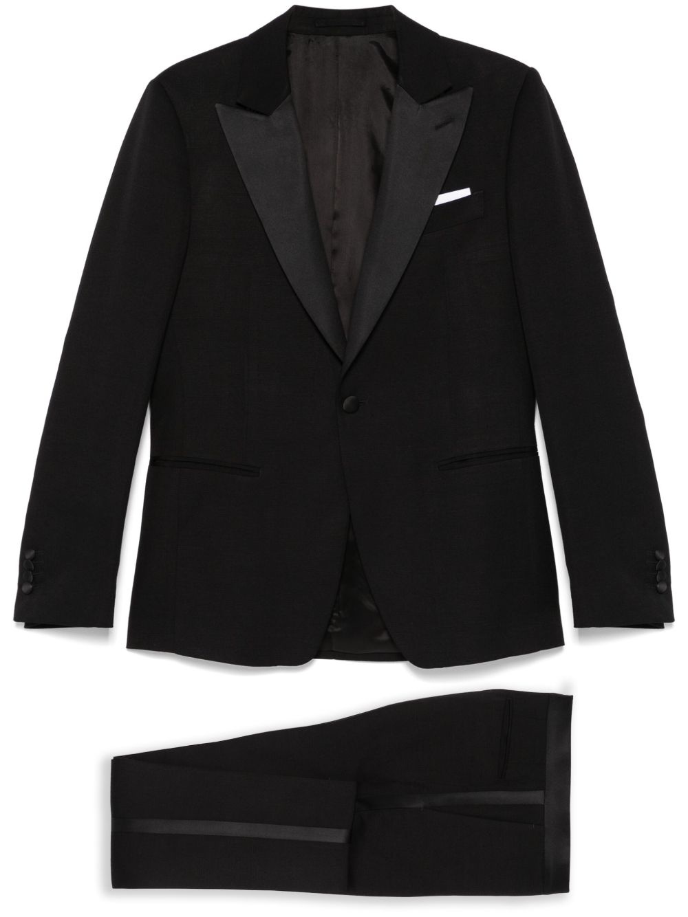 satin-trim suit Highlights - Black - Front button fastening - Concealed front button, hook and zip fastening - Internal patch pockets - English rear vents Made in Italy Composition Viscose 98%, Silk 2% SIZE & FIT Model measurements Height 6 ft 2 in(1.87 m) Bust/Chest 37.79 in(96 cm) Hips 37.79 in(96 cm) Waist 30.31 in(77 cm) FittingInformation Tailored for a slim fit, offering a comfortable fit that sits just away from the body The unfinished hems allow for the length to be altered Made from a midweight non-stretch fabric