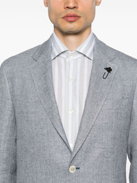 single-breasted blazer Highlights - Light grey - Front button fastening - Chest welt pocket - Two side patch pockets - English rear vents Made in Italy Composition Linen/Flax 75%, Virgin Wool 25% SIZE & FIT Model measurements Height 6 ft 1 in(1.86 m) Bust/Chest 37.4 in(95 cm) Hips 36.22 in(92 cm) Waist 29.52 in(75 cm) FittingInformation Designed for a slim fit, offering a comfortable fit that sits just away from the body The vented hem offers movement at the rear Made from a midweight non-stretch fabric