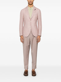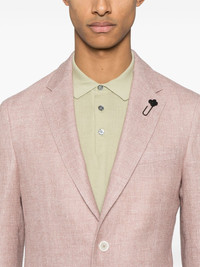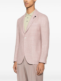 single-breasted blazer Highlights - Light pink - Front button fastening - Chest welt pocket - Two side patch pockets - Buttoned-cuff sleeves Made in Italy Composition Linen/Flax 75%, Virgin Wool 25% SIZE & FIT Model measurements Height 6 ft 2 in(1.87 m) Bust/Chest 38.18 in(97 cm) Hips 36.61 in(93 cm) Waist 29.13 in(74 cm) FittingInformation Designed for a slim fit, offering a comfortable fit that sits just away from the body The vented hem offers movement at the rear Made from a midweight non-stretch fabric