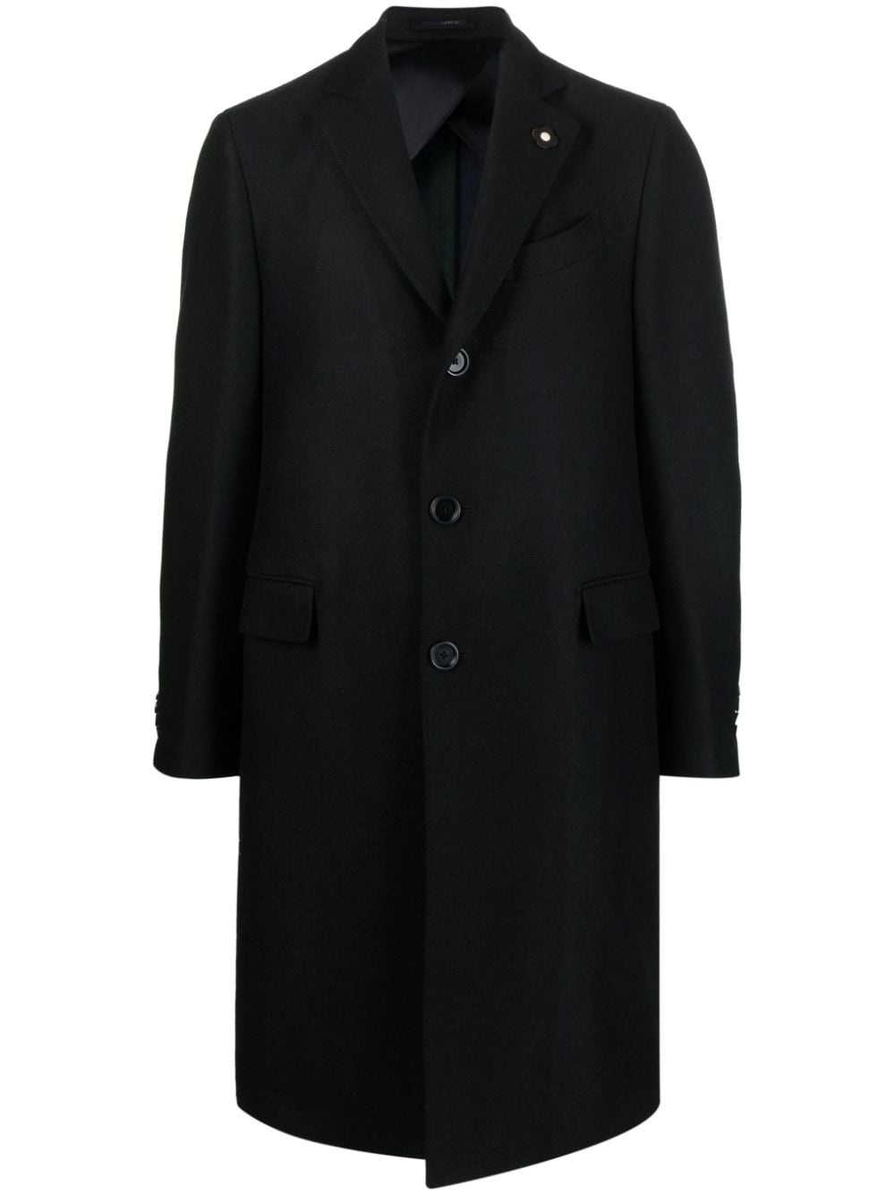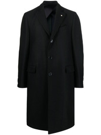 single-breasted boxy wool coat black wool/cashmere front button fastening chest welt pocket two front patch pockets notched lapels rear slit buttoned cuffs Made in Italy Composition Outer: Wool 95%, Cashmere 5% Lining: Acetate 70%, Cupro 30% SIZE & FIT Model measurements Height 6 ft 2 in(1.88 m) Bust/Chest 36.61 in(93 cm) Hips 35.82 in(91 cm) Waist 27.95 in(71 cm) FittingInformation This piece fits true to size. We recommend you get your regular size Cut for a slim fit Made with a mid-weight non-stretch fabric Washing instructions Dry Clean Only