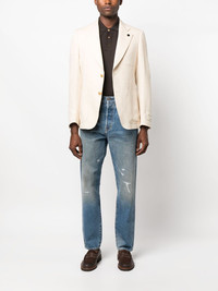 single-breasted cotton-blend blazer Highlights - Beige - Cotton blend - Wide notch lapels - Front button fastening - Long sleeves - Buttoned cuffs - English rear vents - Chest patch pocket - Two side patch pockets Made in Italy Composition Lining: Viscose 100% Outer: Cotton 73%, Linen/Flax 27% SIZE & FIT Model measurements Height 6 ft 2 in(1.88 m) Bust/Chest 36.61 in(93 cm) Hips 35.82 in(91 cm) Waist 27.95 in(71 cm) FittingInformation Designed for a slim fit, offering a comfortable fit that sits just away from the body The vented hem offers movement at the rear Made from a midweight non-stretch fabric This piece fits true to size – take your usual size