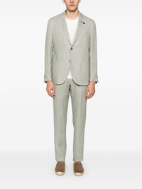 single-breasted suit Highlights - Sage green - Front button fastening - Front button and zip fastening - Chest welt pocket - Two side patch pockets Made in Italy Composition Outer: Linen/Flax 100% Lining: Viscose 52%, Cupro 48% SIZE & FIT Model measurements Height 6 ft 2 in(1.87 m) Bust/Chest 36.41 in(92.5 cm) Hips 35.43 in(90 cm) Waist 29.52 in(75 cm) FittingInformation Tailored for a slim fit, offering a comfortable fit that sits just away from the body The unfinished hems allow for the length to be altered Made from a midweight non-stretch fabric Washing instructions Dry Clean Only