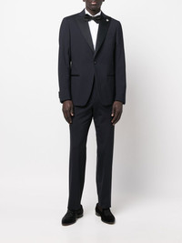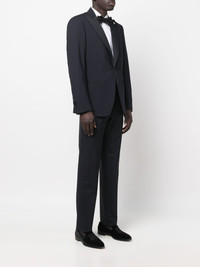 single-breasted tailored suit dark blue wool-blend Jacket: brooch detail peak lapels front button fastening long sleeves curved hem chest welt pocket two front welt pockets Trousers: tailored cut two side slit pockets two rear welt pockets Made in Italy Composition Outer: Polyester 100%, Wool 97%, Spandex/Elastane 3% Lining: Polyester 65%, Viscose 52%, Cupro 48%, Cotton 35% SIZE & FIT Model measurements Height 6 ft 1 in(1.86 m) Bust/Chest 34.64 in(88 cm) Hips 35.43 in(90 cm) Waist 27.16 in(69 cm) FittingInformation This piece fits true to size. We recommend you get your regular size Cut for a slim fit Made with a mid-weight fabric