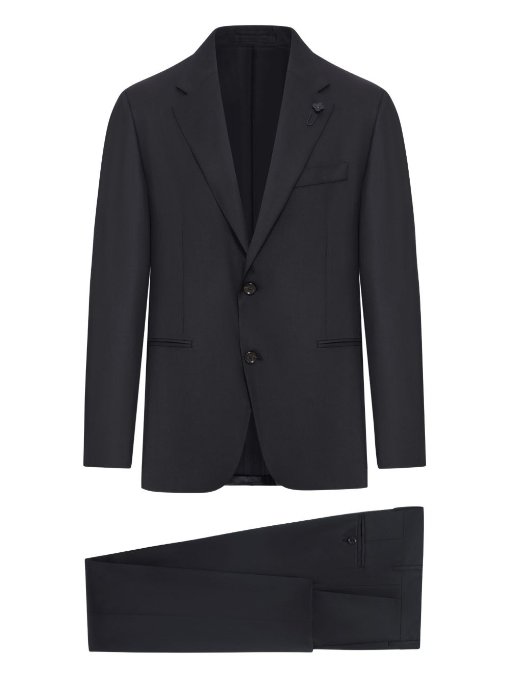 single-breasted wool suit Highlights - Black - Lapel pin - Front button fastening - Flap pocket - Buttoned cuffs - Straight-leg trousers Made in Italy Composition Wool 100% Washing instructions Read Manufacturer Guidelines