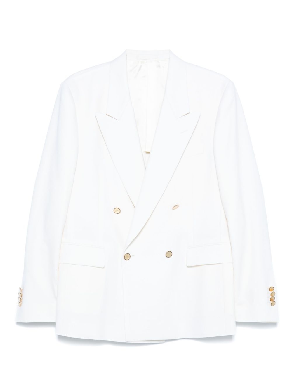 virgin wool-blend double-breasted blazer Highlights - White - Front button fastening - Two side flap pockets - Long sleeves - Buttoned cuffs Made In Italy Composition Cotton 100%, Virgin Wool 98%, Elastane 2% SIZE & FIT Model measurements Height 6 ft 0 in(1.84 m) Bust/Chest 35.82 in(91 cm) Hips 37 in(94 cm) Waist 28.34 in(72 cm) FittingInformation Designed for a slim fit, offering a comfortable fit that sits just away from the body The internal shoulder pads offer a structured shape Made from a midweight stretch fabric, this piece offers elasticity and flexibility when worn