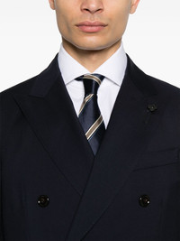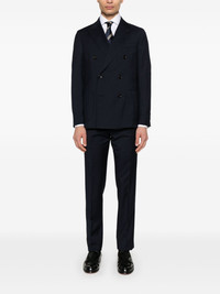 virgin-wool suit Highlights - Midnight blue - Double-breasted button fastening - Concealed fly and button fastening - English rear vents - Belt loops Made in Italy Composition Outer: Virgin Wool 100% Viscose 52%, Cupro 48% SIZE & FIT Model measurements Height 6 ft 1 in(1.85 m) Bust/Chest 35.82 in(91 cm) Hips 37.79 in(96 cm) Waist 29.13 in(74 cm) FittingInformation Tailored for a slim fit, offering a comfortable fit that sits just away from the body The unfinished hems allow for the length to be altered Made from a midweight non-stretch fabric