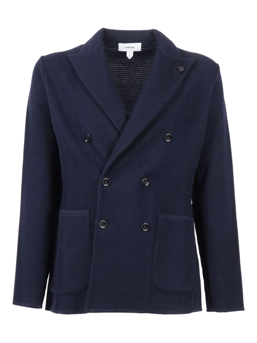 waffle-knit double-breasted blazer Highlights - Dark blue - Waffle knit - Double-breasted closure - Four button fastening - Side patch pockets - Flower-shaped pin detail Made in Italy Composition Virgin Wool 100% Washing instructions Read Manufacturer Guidelines