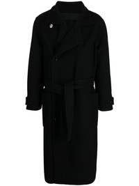 belted double-breasted coat Highlights - Black - Cotton/wool - Off-centre front button fastening - Notched collar - Belted waist - Two front patch pockets - Long sleeves - Buttoned cuffs - Below-knee length - Straight hem - When buying this unisex item, keep in mind that it is graded in standard men's sizing. Imported Composition Lining: Cotton 100% Body: Wool 100% SIZE & FIT Model measurements Height 6 ft 2 in(1.87 m) Bust/Chest 34.25 in(87 cm) Hips 36.22 in(92 cm) Waist 29.52 in(75 cm) FittingInformation This unisex piece is designed for a loose fit whether you usually select women's or men's sizes The tie fastening gives an adaptable and personalised fit Made from a heavyweight non-stretch fabric Measurement CHEST 45.66 in(116 cm) SLEEVE LENGTH 24.4 in(62 cm) HIPS 48.03 in(122 cm) LENGTH 46.85 in(119 cm) WAIST 46.45 in(118 cm) Washing instructions Dry Clean Only
