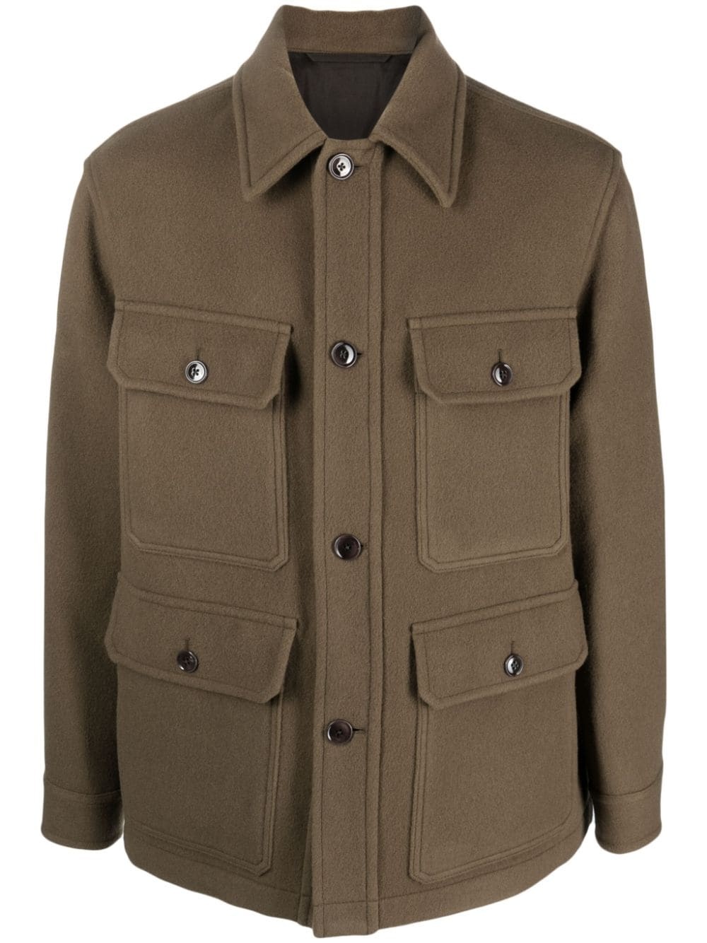 button-down wool shirt jacket Highlights - Khaki - Wool - Classic collar - Front button fastening - Long sleeves - Buttoned cuffs - Two chest flap pockets - Two front flap pockets - Straight hem - Cotton lining Imported Composition Outer: Wool 100% Lining: Cotton 100% SIZE & FIT Model measurements Height 6 ft 2 in(1.89 m) Bust/Chest 35.03 in(89 cm) Hips 38.18 in(97 cm) Waist 29.92 in(76 cm) FittingInformation Designed for a boxy fit, intended for a loose fit throughout Made from a midweight non-stretch fabric This piece fits true to size – take your usual size Washing instructions Dry Clean Only