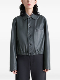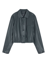 buttoned-up elasticated leather jacket Highlights - Steel grey - Pointed collar - Button closure - Long sleeves - Buttoned cuffs - Jetted chest pocket - Elasticated hem Imported Composition Calf Leather 100% Washing instructions Read Manufacturer Guidelines