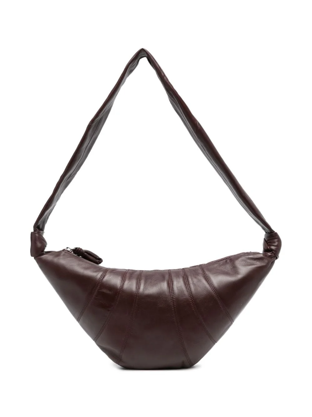 medium Croissant shoulder bag The Croissant shoulder bag is one of Lemaire's standout accessories, and it's defined by its slouchy crescent silhouette. This iteration is crafted from brown leather with diagonal topstitching that's reminiscent of the ribs on the eponymous pastry. Highlights - Coffee brown - Calf leather - Panelled design - Top zip fastening - Main compartment - Internal slip pocket - Internal logo patch - Contrast lining - Although it is new and unworn, due to the specialised recovery and tanning process that lemaire uses for its leather goods, the texture of this piece will display signs of the material's natural grain, softness and creases. Imported Composition Outer: Lamb Skin 100% Lining: Cotton 100% SIZE & FIT Model measurements Height 5 ft 11 in(1.8 m) Bust/Chest 34.25 in(87 cm) Hips 35.82 in(91 cm) Waist 24.8 in(63 cm) Measurement DEPTH 3.93 in(10 cm) HEIGHT 7.87 in(20 cm) STRAP 18.89 in(48 cm) WIDTH 18.5 in(47 cm)