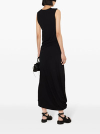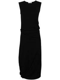 draped crepe maxi dress A new addition to the Twisted family, this dress embodies LEMAIRE's timeless Parisian style. It is made of textured crepe jersey in black with pleated at the waist for a draped construction. Highlights - Black - Cotton - Crepe jersey texture - Pleat detailing - Draped design - Round neck - Sleeveless - Asymmetric hem - Straight hem - Long length - Unlined Imported Composition Cotton 100% SIZE & FIT Model measurements Height 5 ft 10 in(1.78 m) Bust/Chest 29.92 in(76 cm) Hips 34.64 in(88 cm) Waist 23.62 in(60 cm) Measurement LENGTH 53.54 in(136 cm) WAIST 30.7 in(78 cm) BUST 32.28 in(82 cm) Shoulder Width 13.38 in(34 cm) FittingInformation Designed for a slim fit that sits just away from the body offering a close yet comfortable fit Made from a midweight non-stretch fabric, this piece offers minimal elasticity when worn This piece fits true to size – take your usual size Washing instructions Machine Wash