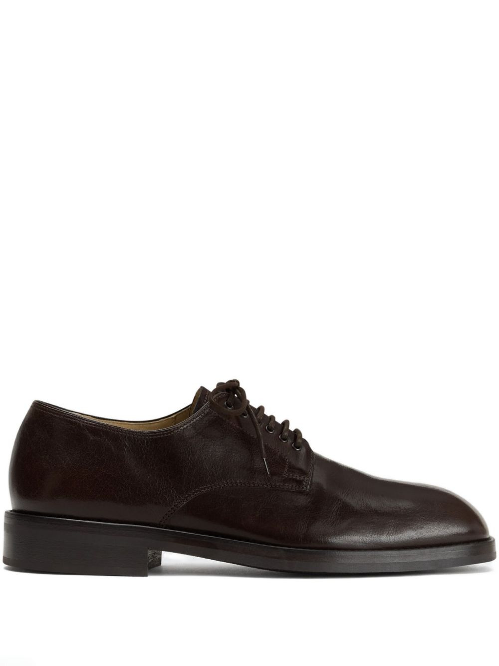 elongated-toe lace-up derby shoes Highlights - Dark brown - Glossy leather - Elongated square toe - Lace-up closure - Waxed cotton laces - Leather outsole Imported Composition Outer: Calf Leather 100% Sole: Calf Leather 100% Lining: Calf Leather 100%