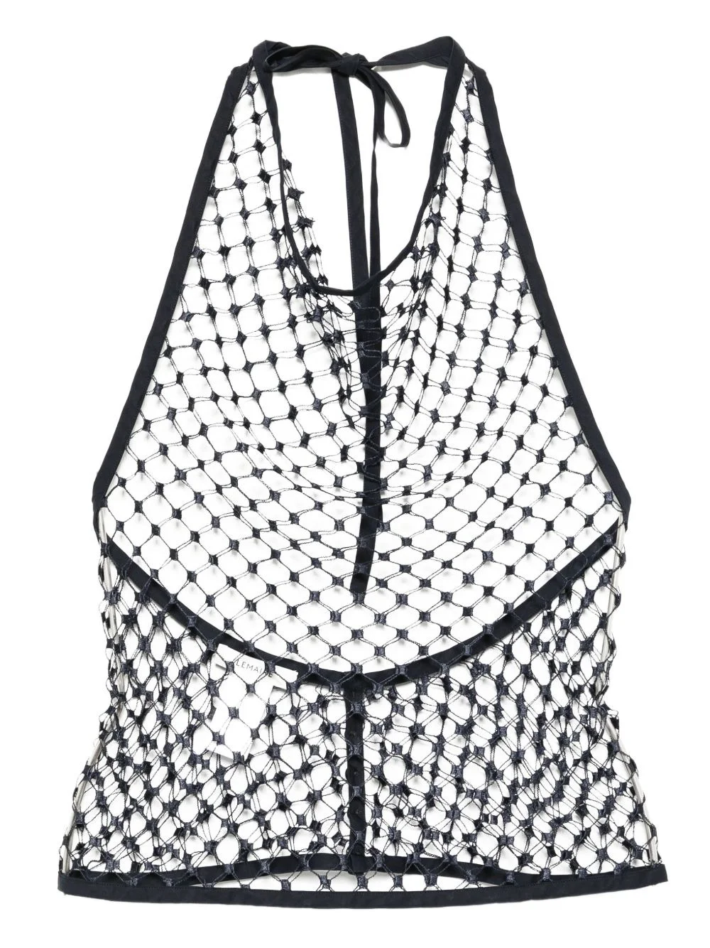 Fishnet halter top Highlights - Navy blue - Rear drawstring slit - Rear button fastening Imported Composition Polyester 100% SIZE & FIT Model measurements Height 5 ft 10 in(1.78 m) Bust/Chest 31.88 in(81 cm) Hips 37 in(94 cm) Waist 25.19 in(64 cm) FittingInformation Designed for a slim fit that sits just away from the body offering a close yet comfortable fit Made from a lightweight non-stretch fabric, this piece offers minimal elasticity when worn Washing instructions Dry Clean Only