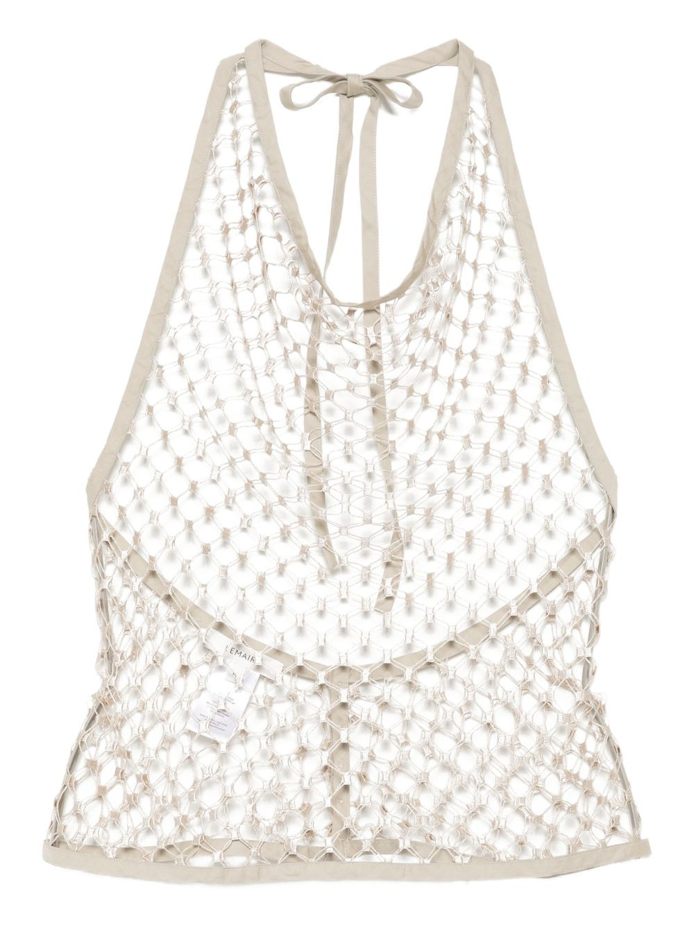 Fishnet halter top Highlights - Beige - Rear drawstring slit - Rear button fastening Imported Composition Polyester 100% SIZE & FIT Model measurements Height 5 ft 10 in(1.78 m) Bust/Chest 31.88 in(81 cm) Hips 37 in(94 cm) Waist 25.19 in(64 cm) FittingInformation Designed for a slim fit that sits just away from the body offering a close yet comfortable fit Made from a lightweight non-stretch fabric, this piece offers minimal elasticity when worn Washing instructions Dry Clean Only