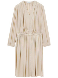 fully-pleated midi dress Highlights - Sand beige - Fully pleated - V-neck - Front button fastening - Belted waist - Long sleeves - Flared hem - Mid-length Imported Composition Viscose 100% SIZE & FIT FittingInformation Designed to be unstructured, offering a loose fit throughout Made from a midweight non-stretch fabric