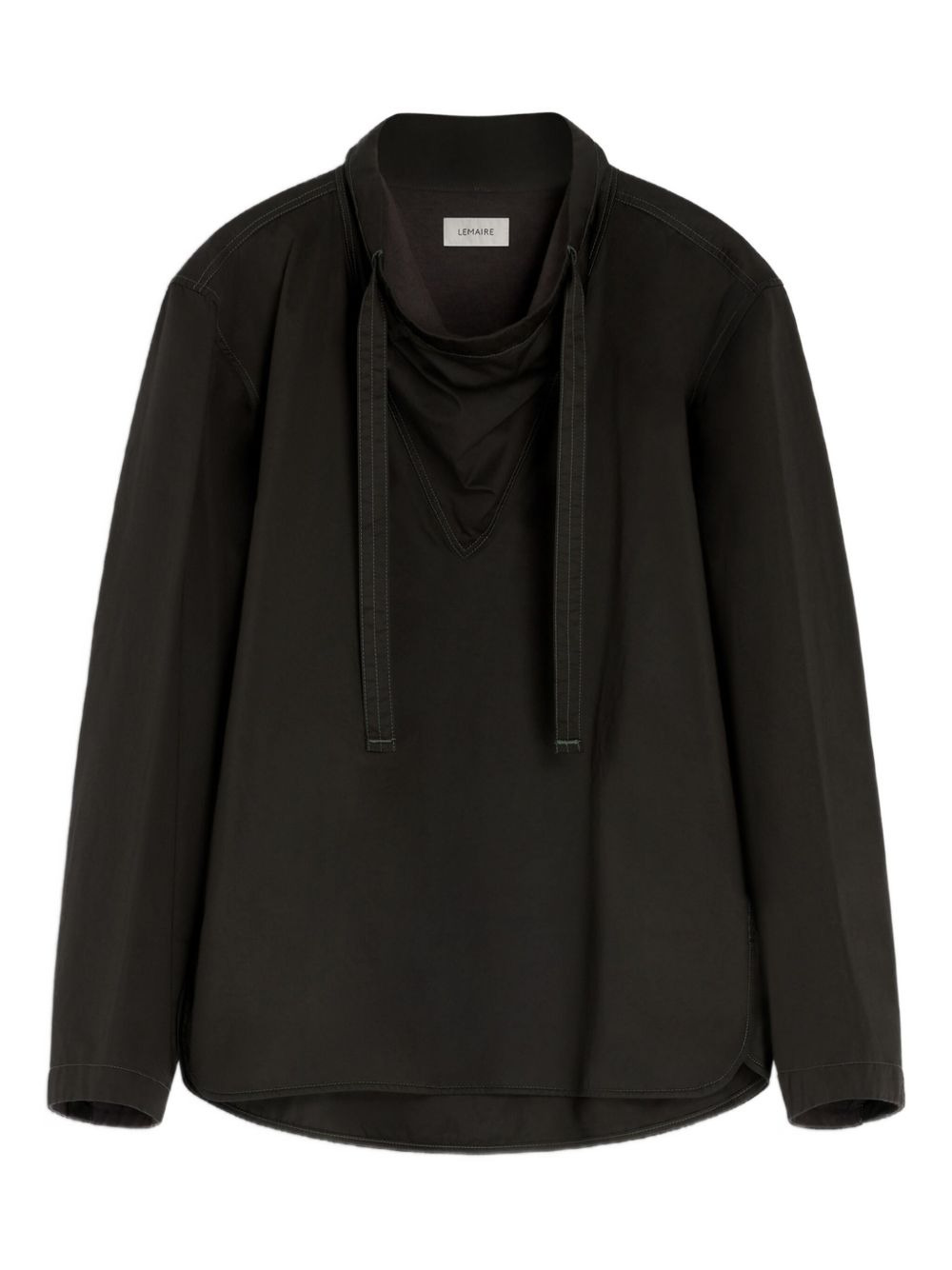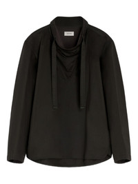 high-neck drawstring blouse Highlights - Dark espresso brown - High neck - Drawstring detail - Long sleeves - Straight buttoned cuffs - Lacquered buttons Imported Composition Fabric 100% Washing instructions Read Manufacturer Guidelines