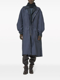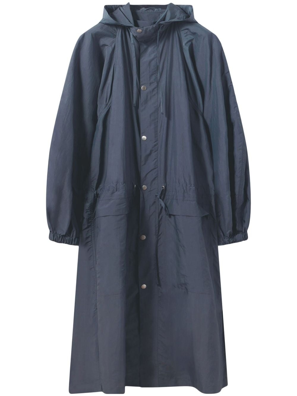 hooded single-breasted raincoat Highlights - Navy blue - Silk blend - Classic hood - Front press-stud fastening - Long sleeves - Elasticated cuffs - Two front patch pockets - Straight hem Made in France Composition Silk 50%, Polyamide 50% Washing instructions Read Manufacturer Guidelines