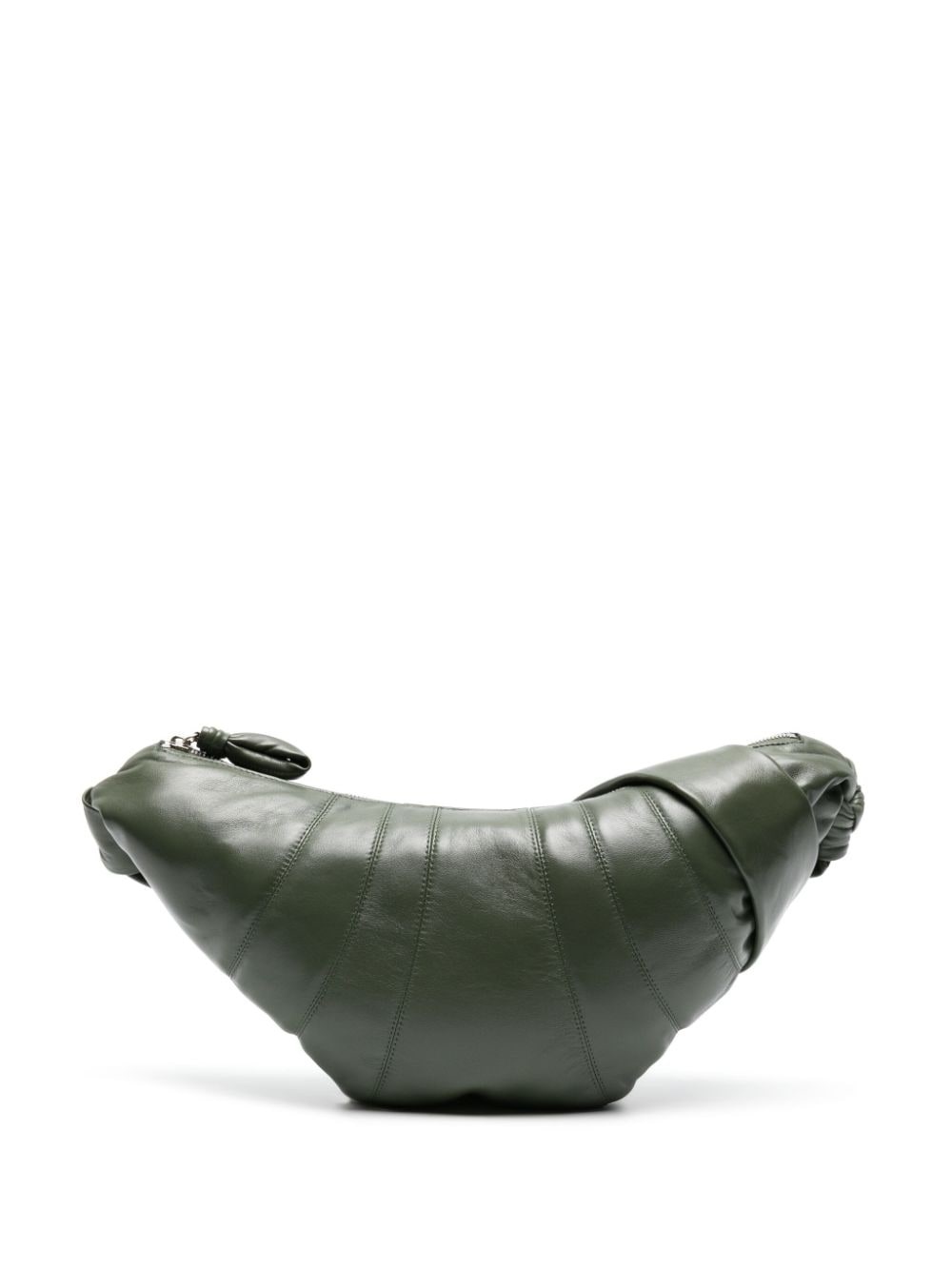 medium Croissant crossbody bag Shaped and stitched to resemble its namesake French pastry, LEMAIRE's Croissant bag is one of the label’s most distinctive styles. This medium version is crafted in supple dark-green leather with signature knots at the strap and zip pull. Highlights - Papyrus green - Lambskin - Panelled design - Single shoulder strap - Knot detailing - Main compartment - Internal patch pocket - Internal logo patch - Cotton-canvas lining - Silver-tone hardware - Top zip fastening - This piece comes complete with a protective dust bag. Imported Composition Lining: Cotton 100% Outer: Lambskin 100% SIZE & FIT Model measurements Height 5 ft 10 in(1.78 m) Bust/Chest 31.49 in(80 cm) Hips 37 in(94 cm) Waist 23.62 in(60 cm) Measurement DEPTH 2.75 in(7 cm) HEIGHT 8.66 in(22 cm) STRAP 16.53 in(42 cm) WIDTH 18.5 in(47 cm)