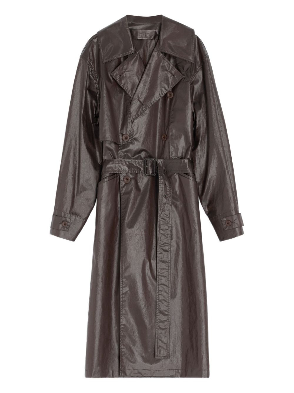 metallic-effect double-breasted trench coat Highlights - Brown - Metallic effect - Double-breasted button closure - Tailored collar - Side pockets - Back vent - Belted Imported Composition Fabric 100% Washing instructions Read Manufacturer Guidelines