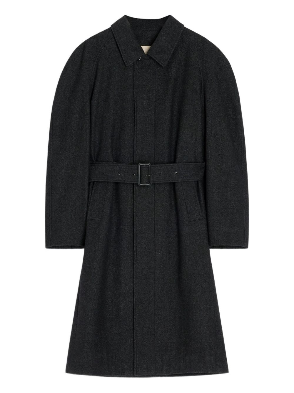 raglan-sleeve belted coat Highlights - Anthracite black - Raglan sleeves - Belted waist - Shirt collar - Hidden button closure - Side pockets Imported Composition Fabric 100% Washing instructions Read Manufacturer Guidelines