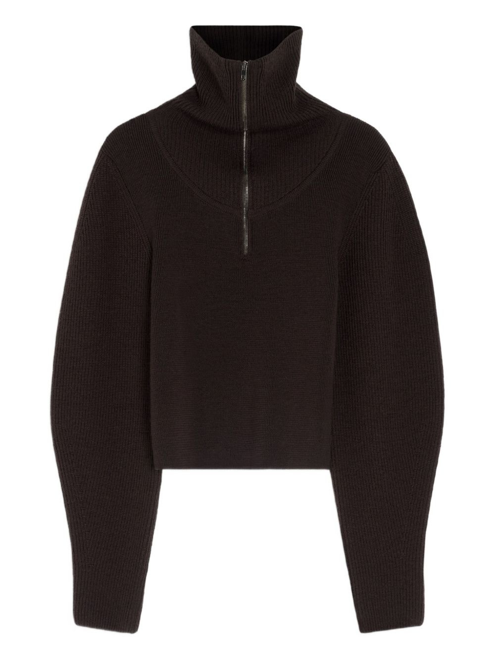 ribbed half-zip sweater Highlights - Brown - Ribbed knit - Half zip fastening - High neck - Long sleeves Imported Composition Fabric 100% Washing instructions Read Manufacturer Guidelines