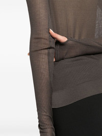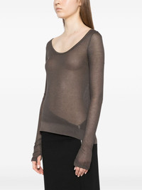 seamless top Highlights - Chocolate brown - Knitted construction - Fine knit - Stretch-design - Sheer - Round neck - Long sleeves - Straight hem Made in France Composition Viscose 88%, Silk 12% SIZE & FIT Model measurements Height 5 ft 10 in(1.77 m) Bust/Chest 27.95 in(71 cm) Hips 34.64 in(88 cm) Waist 22.83 in(58 cm) FittingInformation Designed to be unstructured, offering a loose fit throughout Constructed with additional length on the sleeve Made with a fine knit, this piece offers some stretch