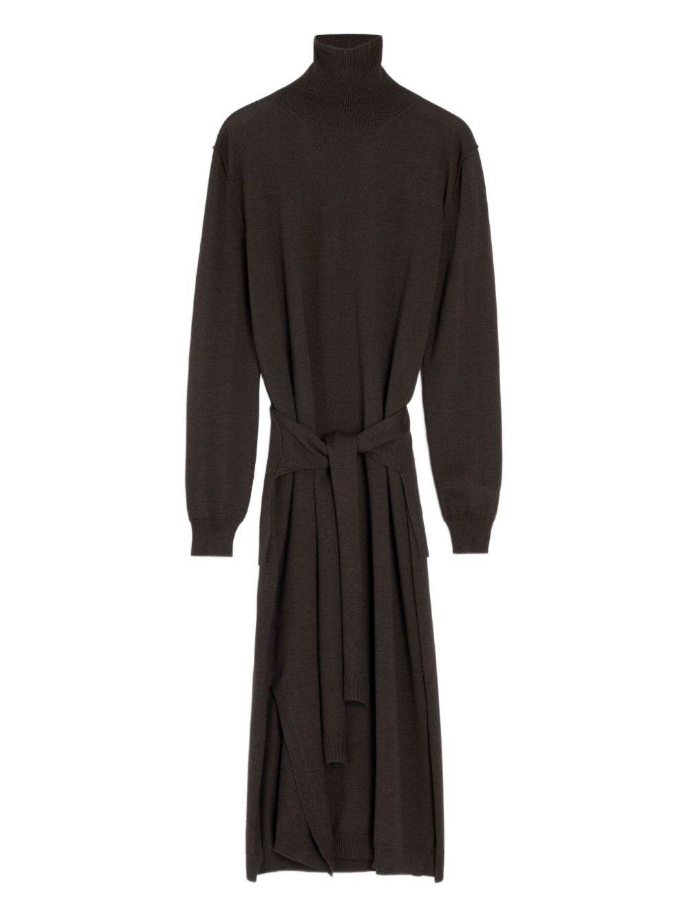 tie-waist knitted dress Highlights - Dark cacao brown - Turtleneck - Long sleeves - Tie-waist belt - Side slits - Rib-knit trim Imported Composition Wool 100% SIZE & FIT FittingInformation Designed for a relaxed fit, this piece allows for comfort and movement when worn The adjustable tie waist gives a more adaptable and personalised fit Made with a midweight knit, this piece offers some stretch Washing instructions Read Manufacturer Guidelines
